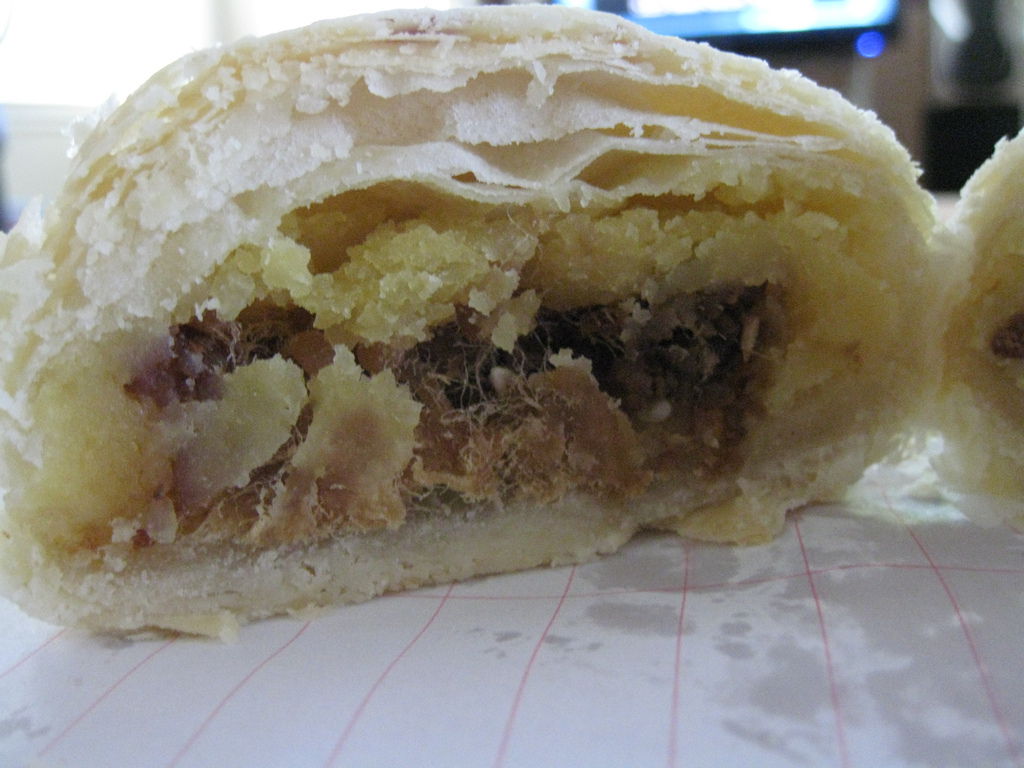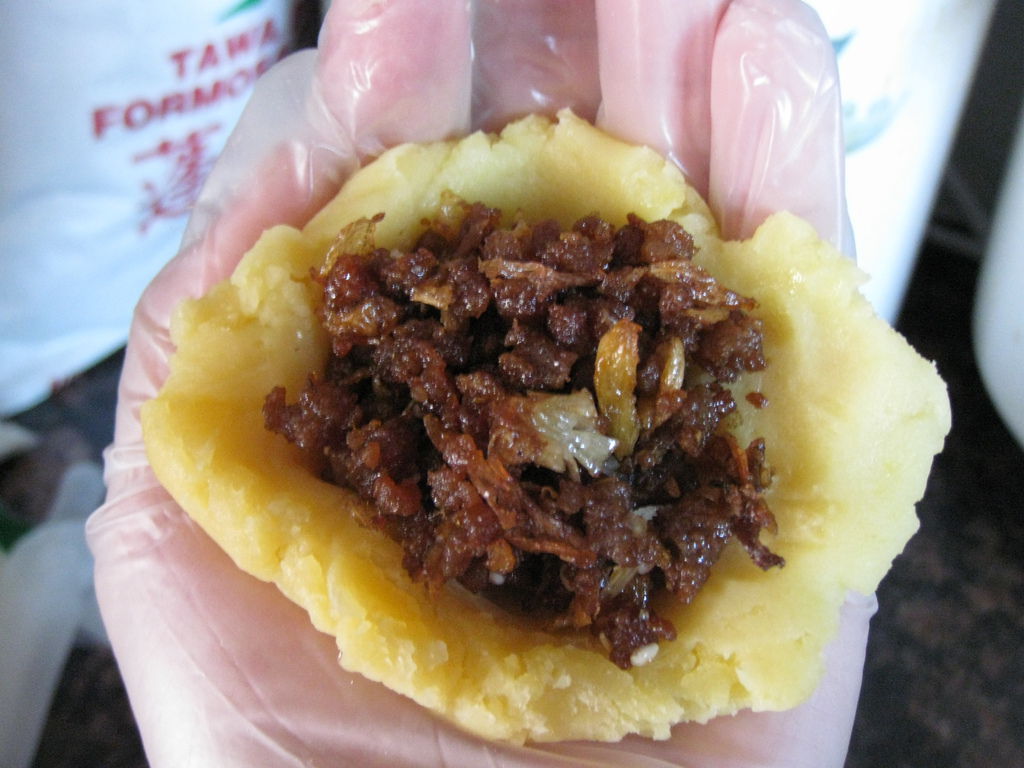 50公克的綠豆沙餡,加上肉燥與肉脯,重量直逼80公克
