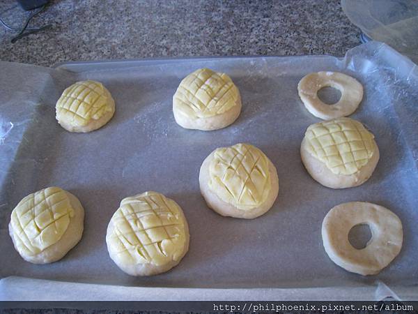 放上自製波羅皮,畫上花紋,取兩個芋頭甜甜圈來一併烤看看,想吃看看口感與油炸的有甚麼不一樣